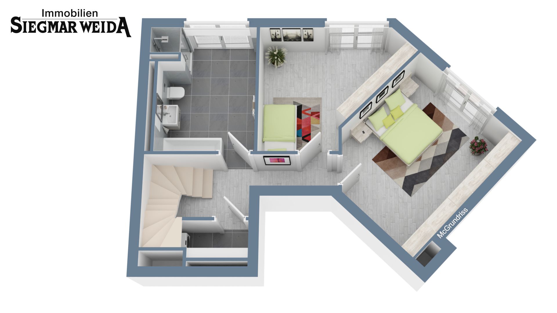 Im Hang-Geschoss befinden sich das Schlaf- und Kinderzimmer, außerdem ein großes helles Badezimmer mit Dusche und Wanne. Zur Information, hier wurden keine bodentiefen Fenster eingebaut.