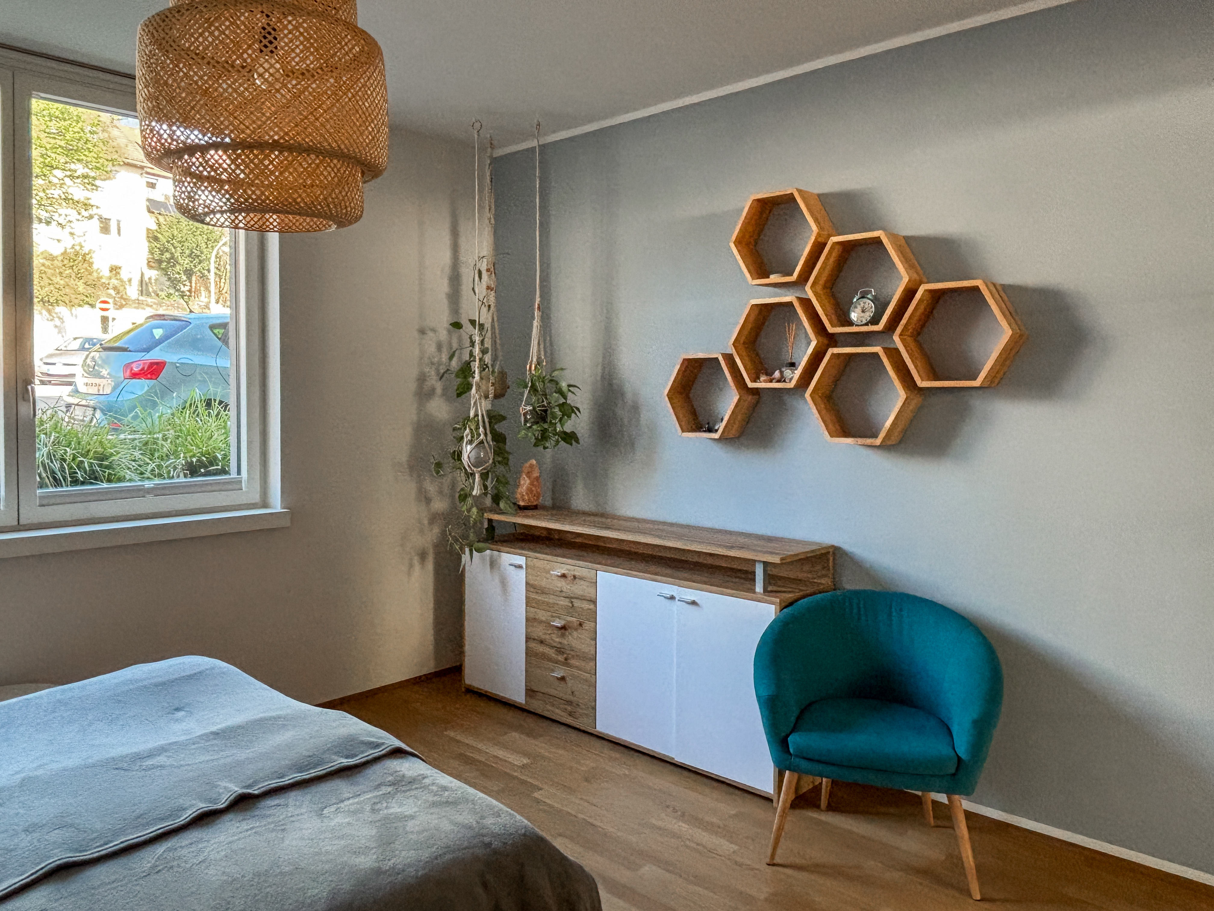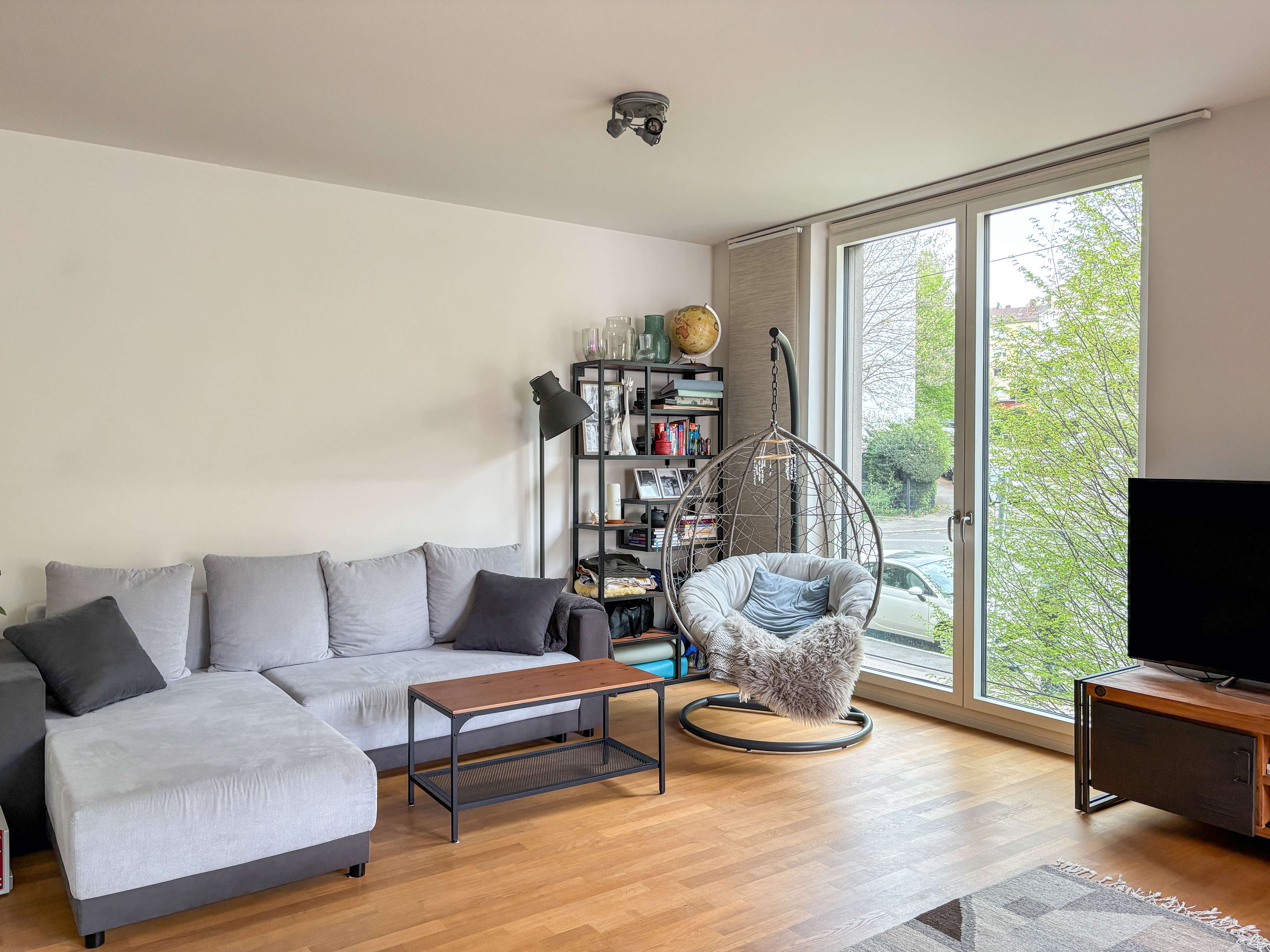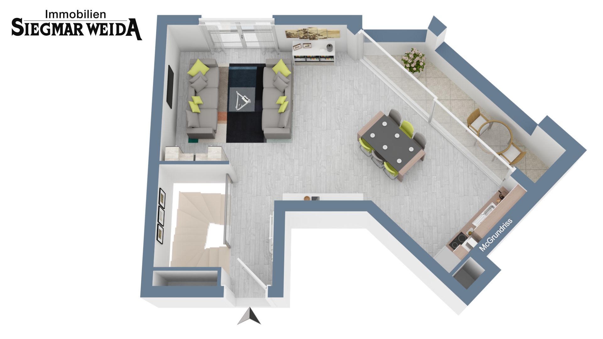 Beim Betreten der Wohnung gelangen Sie in den großzügigen hellen Wohn- und Essbereich, der viel Platz zum Entspannen und Verweilen bietet. Die offene Küche ist modern eingerichtet und lädt zum Kochen ein. Über eine Treppe gelangen Sie ins Hang-Geschoss.
